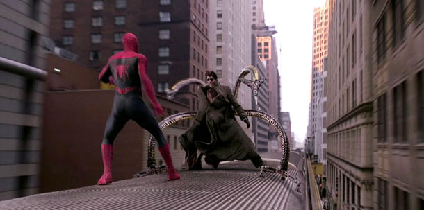Once again I really liked Tobey Maguire as Spider-Man. As I said earlier, he has a strong arc here, an arc which involves a lot of internal conflict. Maguire in the first movie was a little too quirky and geeky, and I wasn’t invested in him. Here though, I actually cared about what Peter was going through, and Tobey did a very good job. Alfred Molina is Doc Ock, the villain of the movie, and he is hands down the best Spider-Man movie villain. He is given some form of complexity, he is a human being. The film doesn’t always handle him the best, as some of his more villainous actions like attempting to crash a train and the way he acted at times really didn’t quite fall in line with his character. He is a little goofy and over the top at times, but it didn’t really bother me (like what happened with Green Goblin in the first movie), he was really entertaining, but sympathetic at the same time. The supporting actors/characters are also a lot better than in the first movie. While I still don’t like Mary Jane and don’t think the romance between her and Peter is done well, Kirsten Dunst does have a lot more to work with, and she once again she does the best she can to make Mary Jane as 3 dimensional a character as possible. With that said, Mary Jane is still a 2 dimensional character, not really that interesting and is just another comic book movie girlfriend. James Franco is great here, in the first movie he really didn’t do much asides from being Peter’s friend, but here he does have a lot more to do, with Harry Osborn looking to get revenge on Spider-Man. J.K. Simmons is also effortlessly entertaining as J. Jonah Jameson, he gets a lot more scenes and he steals every single one of these scenes. And there’s another Bruce Campbell cameo, which is always nice.