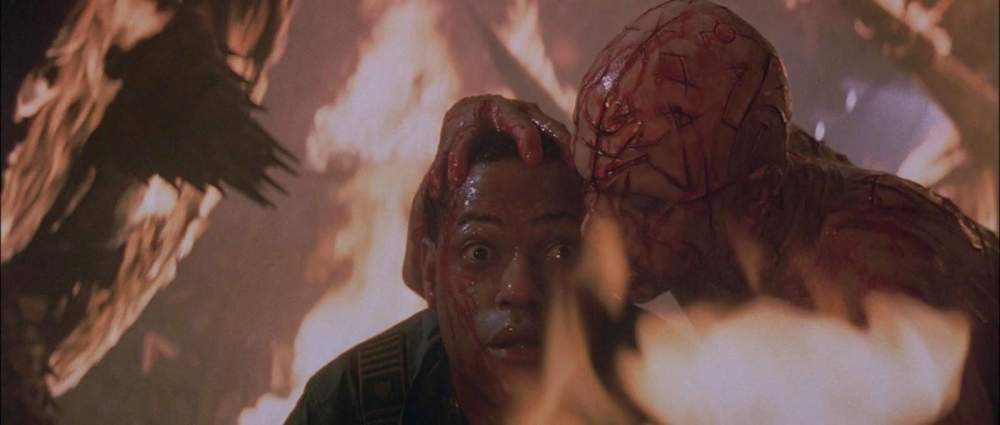 There is a ton of production story explaining what happened with Event Horizon but I’ll try to limit it to the relevant things I’m talking about. Event Horizon has a lot of interesting ideas, the idea of hell being involved is chief among the best, and it wasn’t originally in the script. Phillip Eisner’s original script had alien beings as the cause of the hauntings of the ship but Anderson felt it was too much like Alien, so had a revision of the script done (by Andrew Kevin Walker uncredited) so that it was like a classic haunting movie (like The Haunting and The Shining, there’s even one scene that’s paying homage to the latter), more like a classic haunting movie instead of a monster movie, while also incorporating elements of hell in the movie. I’m thankful that this happened because it’s one of the most stand out parts of the movie. As I said, some of the ideas are pretty good, other aspects can take a little too much from other movies. There’s also some occasionally goofy dialogue and writing that doesn’t ruin the movie but definitely takes you out of it. Now I don’t know if this is the cause of it, but when Paul W.S. Anderson signed on to direct, development had to move quickly cos there was already a release date scheduled (meaning that pre production was likely rushed), so a lot of the script and other elements wasn’t worked on or revised as much as they should’ve been before filming. One thing that really needs to be mentioned is the length, Event Horizon is an hour and 30 minutes long, really quite short. It’s ironic considering that apparently the cut was way too long (even Anderson said that it was too long) and yet it ended up being the shortest length that a typical movie would be. As it is, the movie is fine enough with its length but all the cuts really meant that the story and characters wasn’t really fully realised. Maybe cutting some of the extreme gore (which I’ll get into later) might’ve been understandable and wouldn’t have affected the plot much, but a lot of the plotlines and character development was also cut. 30 minutes were cut from the movie, and I don’t believe that almost all of that was full of extreme gore. There are also attempts at building tension, but the film is cut a lot to speed up the pacing and featuring cheap jumpscares or gore and that can deflate a lot of the tension, no doubt a victim of the tight filming schedule. The ending seems to have 2 endings, and it’s like they couldn’t figure out which one to use so they just used both of them and so it’s just confusing.