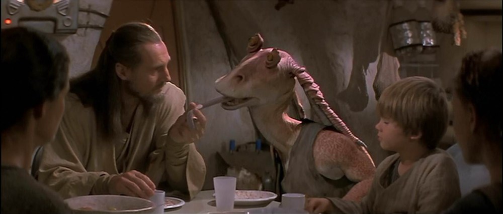 As this is a retrospective review it’s only fitting that this movie is talking about spoilers. So obviously don’t read this or the other Star Wars retrospective reviews if you haven’t watched the movies already. The writing of The Phantom Menace is a very mixed bag, while some of the ideas are fine enough, most of the executions weren’t handled well. The story goes in and out of being interesting, more often than not however I wasn’t very engaged. A lot of the dialogue is very formal, stiff and unnatural for most of the characters. In the case of the Jedi, it works, but I’m not so sure why every other character acts like that too. Not to mention so much of the dialogue is really bland and even cheesy. Not to say that the original Star Wars trilogy was like that (a little more than a lot of Star Wars fans would like to admit), but the prequel trilogy is even more so. One thing I consistently liked about this movie and the prequels was the introduction of new worlds, as well as it expanding upon the lore and the universe. The first act starts off fine enough, but it has its issues. The Gungan parts were handled a little weirdly. Though to be fair most of it comes from the fact that Jar Jar Binks is meant to be our insight to the Gungans, and we don’t really learn a whole lot from him about them (more on that later).