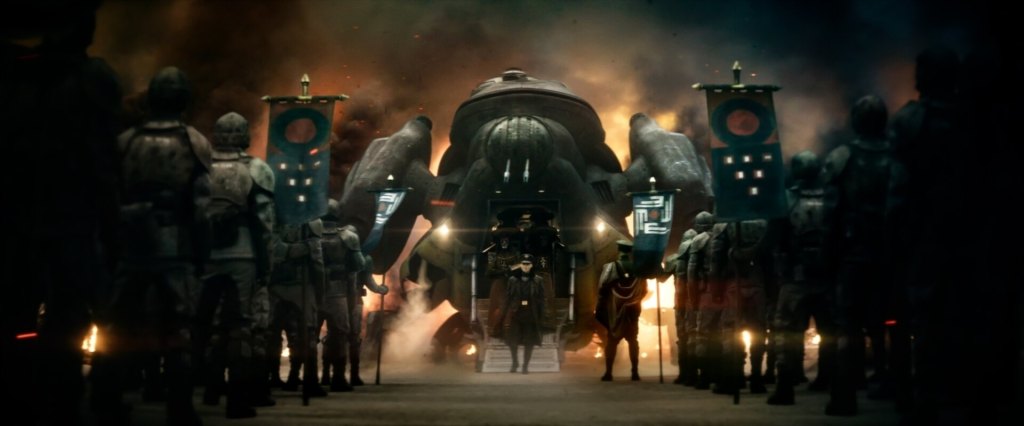 Sofia Boutella is great in the lead role of Kora, bringing a lot of emotion and believability to the protagonist. The supporting cast is good with the likes of Djimon Hounsou, Michiel Huisman, Bae Doona, Ray Fisher, Charlie Hunnam, and Staz Nair. I did wish that we could’ve gotten to have seen more from certain actors like Fisher though. Ed Skrein as the central villain Admiral Noble remains my favourite performance from these films. His character is so committed to being as evil as possible and Skrein is absolutely relishing his role. A few of the actors/characters are done a bit better in this version of the film. Anthony Hopkins voices a robot named Jimmy, and he has a lot more screentime throughout the movie’s runtime, compared to A Child of Fire where he is absent after the first act. We see him as he gradually goes through a transformation and self-realisation, and it sets him up for his role in the second chapter. There’s also a character called Aris played by Sky Yang who is given a lot more to do here, especially with his backstory being in the opening sequence which adds so much more to his character.