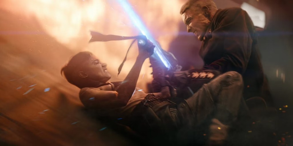 Sofia Boutella is great as usual as protagonist Kora and delivers on both the action scenes and the emotion. The supporting cast in Djimon Hounsou, Michiel Huisman, Doona Bae, Staz Nair, and Elise Duffy are really good too, and this new cut does at least give them a few more moments to shine compared to the original version. Ed Skrein is again excellent as the villainous Admiral Noble, even if he doesn’t get as much here as he did in the first film, the extended and additional scenes (especially with the R rating) does give him more of a chance to shine. The robot character of Jimmy voiced by Anthony Hopkins definitely has some new scenes which add to his character. He is definitely better used here than in The Scargiver, though his role in the action half still keeps him in a deus ex machina role. That said, the increased level of violence with the R rating makes his action scenes stand out far more this time.