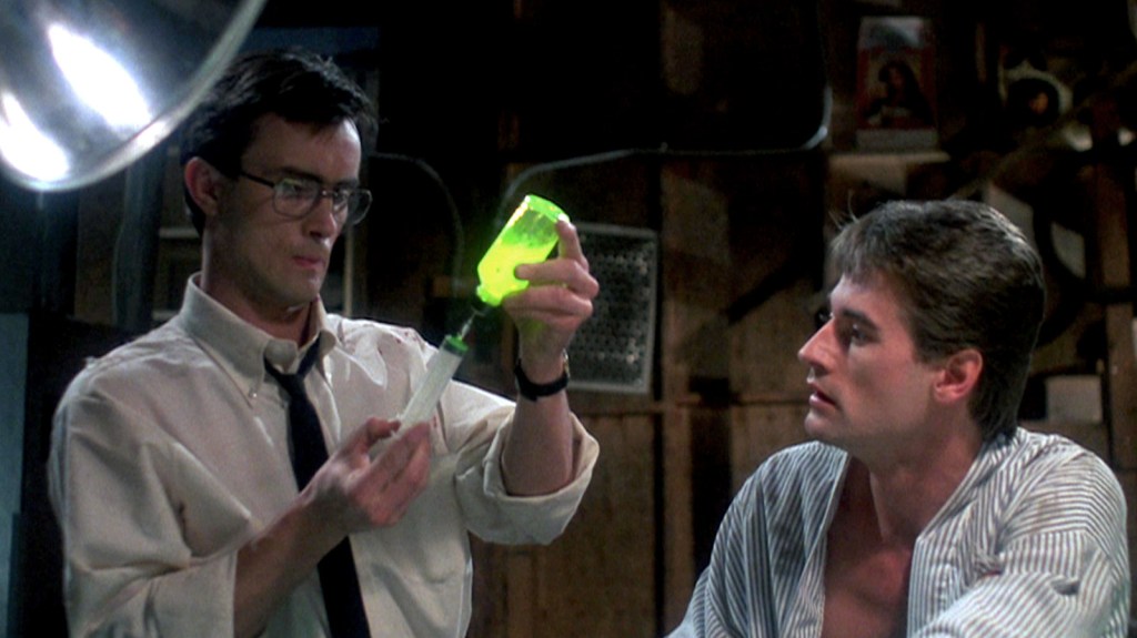 For a silly low budget horror movie, the performances are great. One of the highlights of the film was the character of Herbert West, played wonderfully by Jeffrey Combs. As this interestingly weird, ruthless and mad scientist, Combs has such a manic screen presence that you can’t look away from. He is hilariously over the top and makes the movie even more fun to watch. Bruce Abbott and Barbara Crampton are really good at conveying their characters’ fear and vulnerability, and David Gale makes for a solid and theatrically over the top villain.
