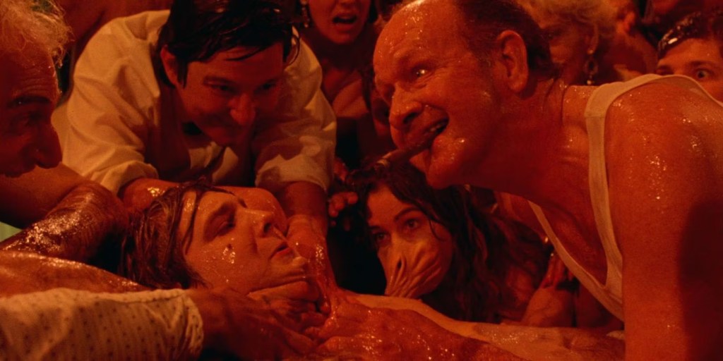 Society starts out as a paranoid thriller, focussing on a teenager not fitting in with his family and the people around him, before he stumbles onto a town wide conspiracy. It’s a mystery for most of the runtime and is told mainly through the protagonist’s perspective, and with how things play out, I’d recommend going into this movie blind. The movie is partly about how rich families’ lavish lifestyles are alienating to others’, and based on that, you can already tell that much of the movie is a satire about the rich. There is plenty of heavy handed commentary about power, wealth, and the upper class elites feeding off the poor and disenfranchised. It’s very on the nose, but it kind of works here. The first two acts are pretty fun, but the movie becomes something else entirely when it enters its third act. I won’t go into too much depth, but the climax is far more depraved, repulsive and wacky than everything that came before, and has to be seen to be believed. The writing isn’t exactly the best, and the dialogue is particularly bad in parts. However, I think that the silliness and the tone does make its flaws work in sync with the movie, especially with the dark comedy.
